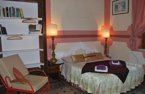 The spacious bedroom has a ceiling of 4 meters high, covered by a vintage wooden boiserie. The walls are hand-decorated.