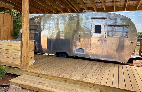 Escape time with the luxuries of modern day in a vintage1952 Boles Aero camper. Built in Burbank, California, this RV will bring you back to the yesteryears of a generation forgotten! Nestled in the heart of Washington County and minutes from Round Top and Brenham, this unique outdoor setting provides a fun alternative to traditional lodging. The stylish stainless interior, funky fresh dinette, cozy bath, and comfy lush mattress of this retro RV provides all the conveniences one would need. Adding to the experience, guests are greeted by an inviting outdoor space. The covered patio area includes an outdoor kitchen, sitting and fireplace area and a full outdoor bathroom for the adventure seekers at heart! Whether you are antiquing in Roundtop, in town catching live music, cruising the backroads on two wheels, or just seeking an amazing sunset, The Vintage Aero is the place for you.