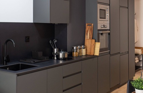 The studio apartment is a versatile space that accommodates both relaxation and productivity. The well-appointed living area is furnished with comfortable seating, perfect for unwinding after a day of exploring the city. Whether you're watching your favorite shows on the flat-screen TV or catching up on work, you'll find everything you need for a pleasant stay.