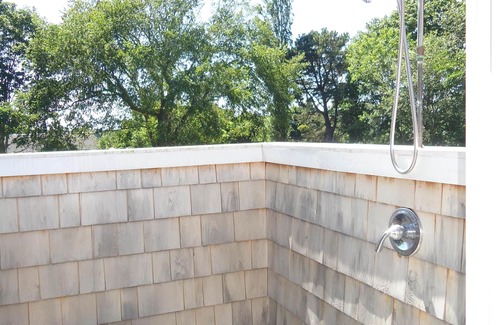 The pool house is a separate three room building steps from the pool and the perfect place to play games or have a shady lunch on a sunny day. The pool house has 10' ceilings, a sectional sofa, cabinets filled with board games, a wet bar with a beverage fridge and separate ice maker & a full bath with an additional outdoor shower to wash away all the sand from the beach - all cooled by a ductless A/C system.