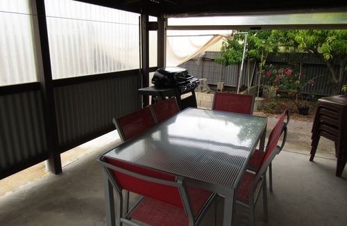 Undercover rear verandah with outdoor table/chairs, hooded gas BBQ.