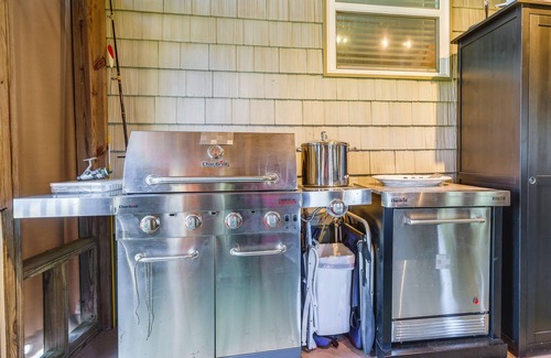 OUTDOOR LIVING: 2 boat slips, waders, crab traps, pergola w/ Adirondack chairs, screened porch w/ dining table, 2 extra-wide zero gravity loungers, gas grill (propane provided), charcoal grill (BYOC), yard, beach chairs & towels
