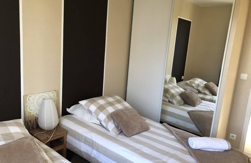 Very bright and functional at the bottom of Villa / House of two apartments located in a very quiet area. This accommodation offers 1 garden of 500 m², 1 beautiful covered terrace of 40m² with dining area "barbecue & Plancha", 1 swimming pool equipped with a security device facing due south, 2 free parking spaces, 3 bedrooms (2 140cm beds) and 2 twin beds of 90cm), a spacious living room with TV, a fitted and very well equipped kitchen (Dishwasher, Oven, Microwave, Induction hob, Refrigerator, Freezer…) 1 bathroom with Italian shower / WC, 1 independent WC / washbasin, washing machine, free WIFI.