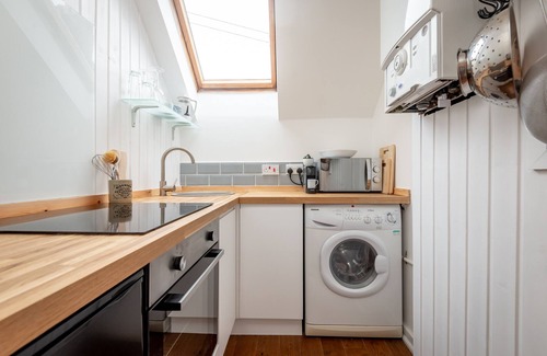 High ceiling with original beams, solid oak floors. This light, airy wee space has a double bedroom area off the lounge, cleverly divided with bi-fold glass doors - check out all the photos! Separate room for kitchen with solid wooden worktops and Nespresso machine. A delightful, stylish space with modern, bright features.
