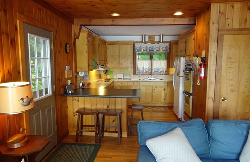 Bring your furry friends along and unwind in the coziness of Dorie's Cottage, a charming pine-paneled abode tucked away in the woods on the eastern shore of Crescent Lake. Known for gorgeous sunsets, the property features a well-appointed kitchen, screened porch, deck with large grill, use of a canoe and kayak, and a 240v electric car charging outlet. There is now a Solo Stove at the property so you can enjoy s'mores by the water at night! The dock is perfect for catching some rays, swimming, and keeping your boat anchored while you birdwatch for loons, eagles, and kingfishers. For those who enjoy hiking, the Loon Echo Land Trust Raymond Community Forest hiking trails are easily accessible and lead to Pismire Bluff, offering a stunning panoramic view of the lake. The dock can accommodate boats up to 16', and the natural woods provide plenty of shaded areas for relaxing on a hot day. The path to the waterfront and dock is layered with bark mulch and steps, with the water being 1' deep at the rocky entry which gradually leads to a sandy bottom. The best swimming spot is right off the dock, so jump on in! If you're seeking a serene and picturesque vacation, full of swimming, boating, and relaxation, then Dorie's Cottage is the place for you!