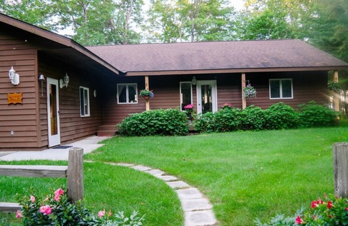 Located on beautiful West Twin Lake on three scenic acres this year round lakefront home is beautifully furnished along with plank flooring and granite countertops and amazing views from almost every room. The home is suitable for families with young children or older couples. The home comfortably sleeps 8 to 10 people. Included with your stay is an Oasis floating pad and canoe. A beautiful Bennington 25' Pontoon boat with a four stroke Yamaha engine is available to rent during your stay.