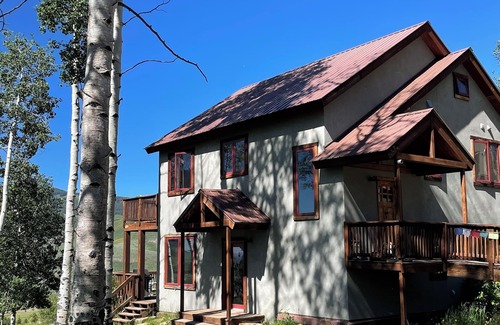 Serene mountain home in Crested Butte South with the best views in the Valley. Peaceful, quiet location nestled in a mature Aspen grove with expansive views to the west and south. Perfect for families; the house sits on a dead end road above the busier grid of CB South. Open floor plan with wrap-around windows and large bar in the kitchen for cooking and entertaining. Cozy in winter and shaded and breezy in the summer. A true mountain retreat!