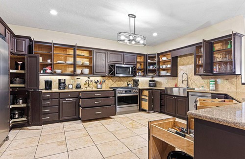 - Oversized dual fuel range in a fully equipped gourmet kitchen
