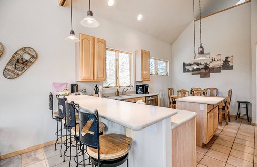 The fully equipped kitchen has lots of counter space, stainless steel appliances (including a gas range) and all the gear you’ll need to keep the troops happy and fed. There’s seating for six at the dining table and room for four more at the counter. Just outside you’ll find a deck with an outdoor dining table and a gas grill – and again, those great mountain views!