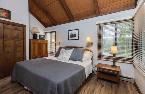 This secluded Chalet has minimal stairs, most rooms and deck on same level. Ideal work-from-home alternative for staycation or weekend get-away for families. This cozy home features high vaulted ceilings, 3 large bedrooms, 2 full bathrooms and a huge deck that wraps around the entire back of the home with terrific mountain views through the treetops. Located just 150 yds from top of 3 slopes, easy public access w/o need to shuttle.
