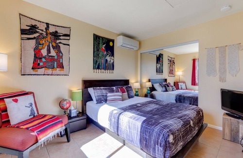 Inside of your sweet home away from home, you'll spy a quaint interior decor, set up with a unique traditional aesthetic. Take a load off in the living area and enjoy the colorful surroundings, with each room imbued with a different color. Sit out on the patio and gaze out at the mountain view in the distance while you sip on a delicious beverage in your enclosed yard. Spark up the firepit and roast some marshmallows as the evening comes to a close. Then, head back inside and end the night by streaming one of your favorite movies directly from the comfort of your own couch!