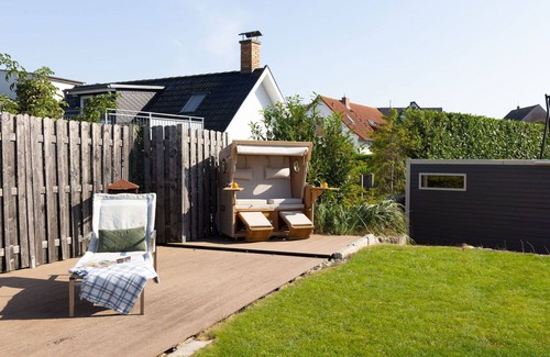 The "Strandhaus" is a 6-room villa spanning 200 square meters on the ground floor. The spacious and bright accommodation boasts a very modern and stylish furnishing style. The living/dining room is equipped with satellite TV (flat screen) and provides access to the terrace. There is a children's room with 1 x 2 bunk beds (80 cm, length 200 cm) and satellite TV (flat screen). Another room features 1 double fold-away bed (1 x 140 cm, length 200 cm). Additionally, there are two more rooms, one with 1 double bed (160 cm, length 200 cm) and satellite TV (flat screen), and the other with 1 double bed (180 cm, length 200 cm).