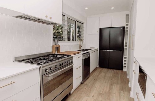 Step inside to discover an inviting open-plan living space, designed for both relaxation and entertaining. The contemporary kitchen features top-of-the-line appliances including a free standing Smeg 6 burner gas stove top and oven, espresso coffee machine and ample bench space making meal preparation a breeze. Gather around the 8 seater dining table for memorable meals with your loved ones.