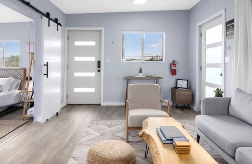 Sitting on 5 private acres filled with native Joshua Trees and breathtaking views, this adorable 1 bedroom, 1 bath bungalow provides a relaxing experience and is just minutes from Joshua Tree National Park. The perfect place for up to 4 friends to enjoy the otherworldly nighttime sky while making memories lounging on the hammocks, soaking in the pool or cooking meals in the fully-equipped kitchen. Easy access to Joshua Tree’s cute and eclectic downtown with various shops and local food options.